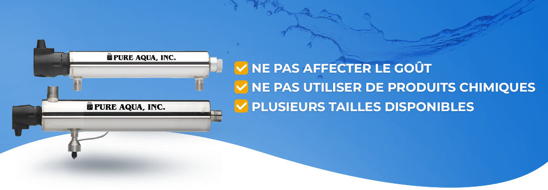 Les systèmes UVIC de Pure Aqua éliminent virtuellement les contaminants microbiologiques sans utiliser potentiellement de produit chimique hasardeux. L’eau entre part la partie inférieure du générateur de cellule ultraviolet et tourbillonne autour d’une lampe à vapeur de mercure à faible pression, qui émet une puissante lumière ultraviolette d’énergie 235,7 nm de longueur d’onde. Les bactéries, les virus et les autres microorganismes absorbent l’énergie de la lumière ce qui perturbent leurs ADN et sont détruits en toute sécurité à l’intérieur d’un réservoir en acier inoxydable testé en usine pour contenir les cellules. L’eau traitée sort ensuite part la partie supérieure de la cellule et est prête) être consommé.